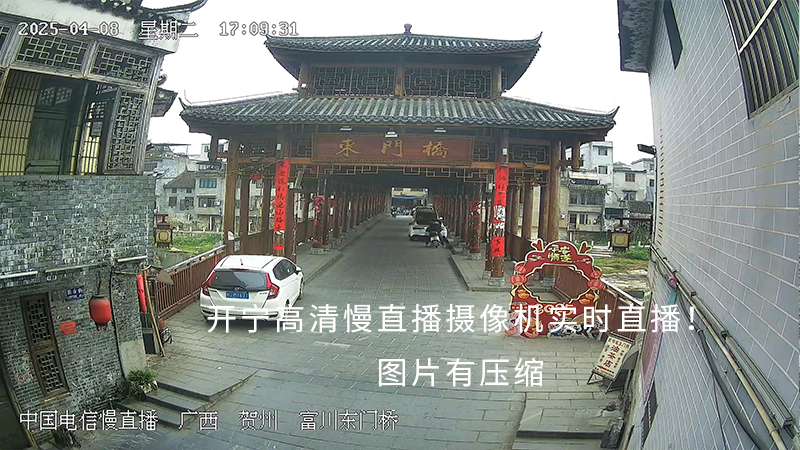 廣西賀州富川瑤族自治縣老城區(qū),東門橋如一條青黛色的紐帶,橫跨在秀美的富江之上。這座始建于明代的石拱橋,由青石板鋪就的橋面被歲月磨得溫潤發(fā)光,弧形橋身與水中倒影構(gòu)成完美的“圓”,兩側(cè)護(hù)欄上隱約可見的瑤族圖騰雕花,承載著瑤漢同胞世代共生的記憶。作為富川“古八景”之一,東門橋不僅是連接老城與瑤寨的交通要道,更是瑤族同胞趕圩、節(jié)慶聚會的核心場所,但因地處桂北山區(qū),其“古橋映江、瑤風(fēng)拂面”的獨特景致,難以被遠(yuǎn)方游客知曉。為打破地域阻隔,當(dāng)?shù)匚穆貌块T聯(lián)合中國電信與開寧科技,以開寧高清全彩慢直播攝像機(jī)為核心,搭建東門橋?qū)崟r慢直播體系,讓這座千年古橋的韻味通過鏡頭觸達(dá)全國。