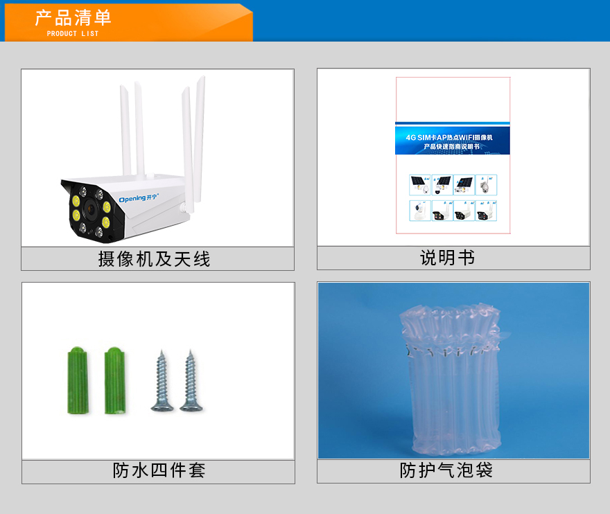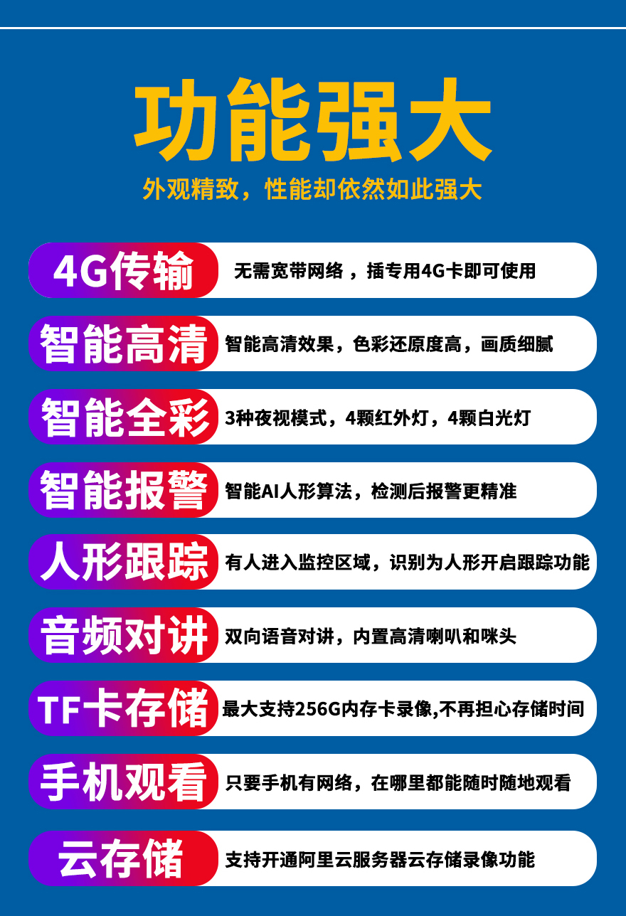 - 1、200萬(1080P)4G無線智能全彩網(wǎng)絡(luò)高清攝像機(jī),一個(gè)攝像頭就是1套監(jiān)控系統(tǒng);