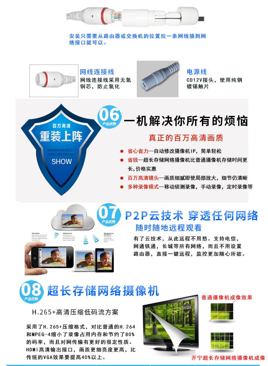 ★星光日夜全彩、960P/1080P(130萬/200萬)、超長存儲、智能高清、全網(wǎng)通、低碼流、低照度、低功耗、H.264+雙碼流、防靜電、防浪涌、過壓保護(hù)、移動偵測報警。