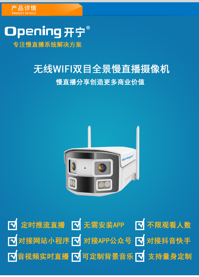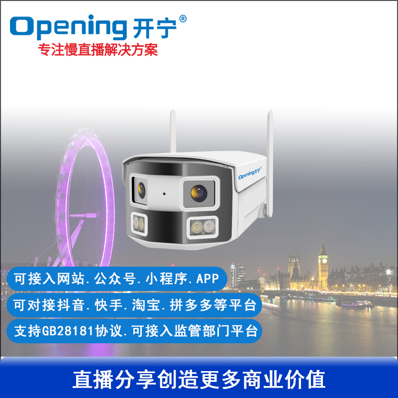 - 1、400萬雙目拼接雙光槍式慢直播攝像機(jī),1個(gè)攝像機(jī)就是一套慢直播系統(tǒng);雙目拼接180度超廣角;