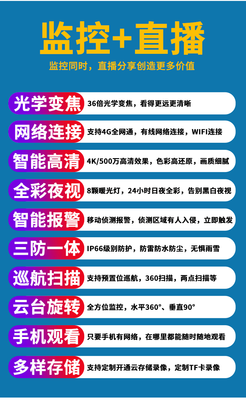 10、8顆進(jìn)口高效能點(diǎn)陣暖光燈,全彩夜視1-150米;36倍變焦鏡頭;