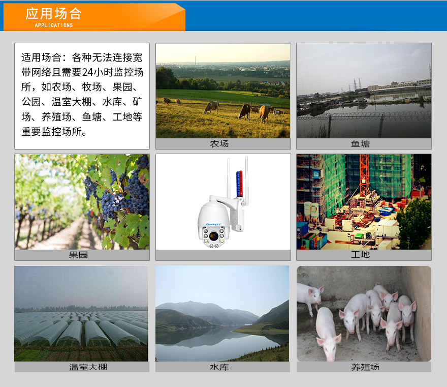 2、內(nèi)置智能4G模塊;適用場(chǎng)所:養(yǎng)殖/種植/工地/公園/公路/野外等沒(méi)網(wǎng)絡(luò)地方;