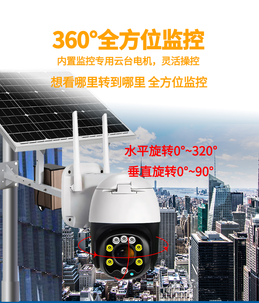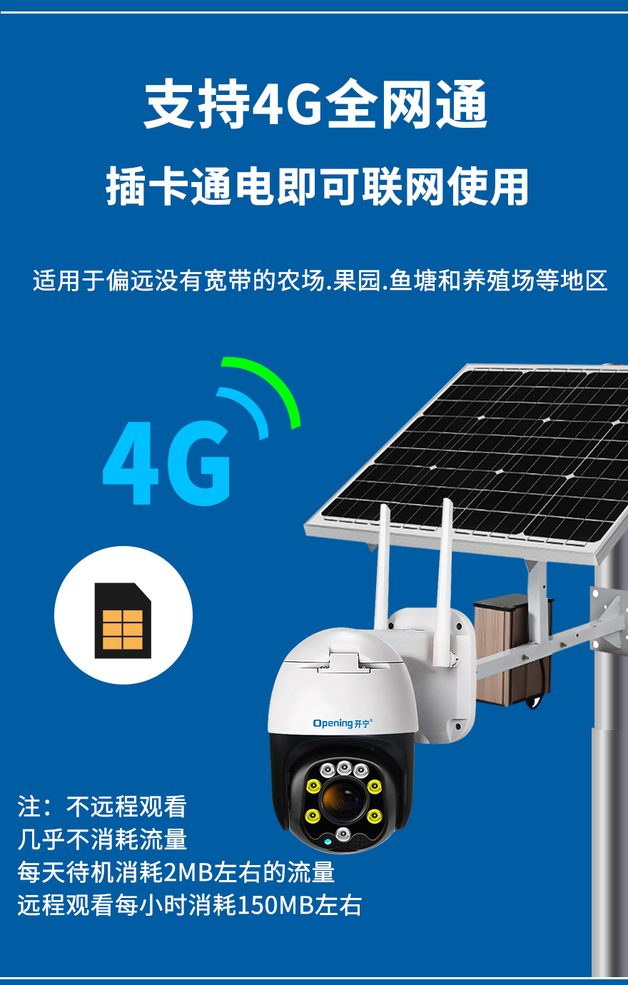 - ★這是一款開寧4G無線太陽能供電監(jiān)控系統(tǒng),一個機器就相當于一套監(jiān)控系統(tǒng),無電無網(wǎng)也可以使用;