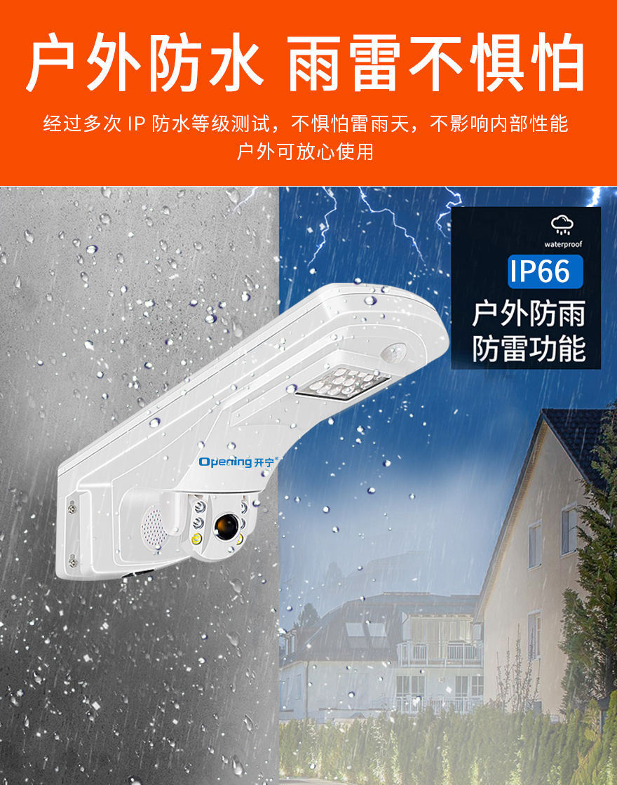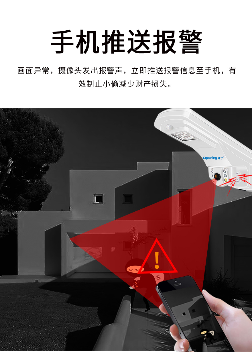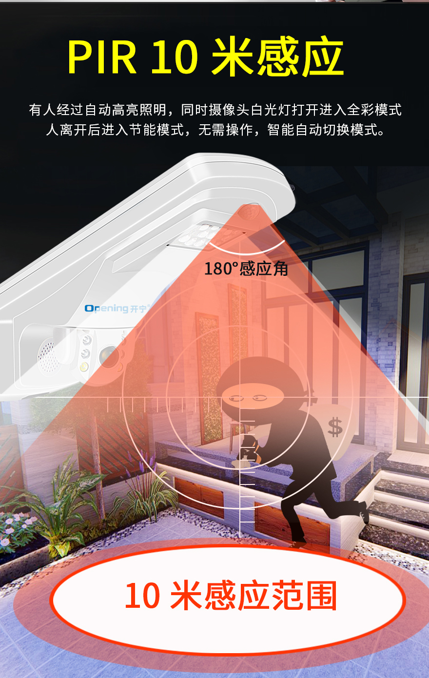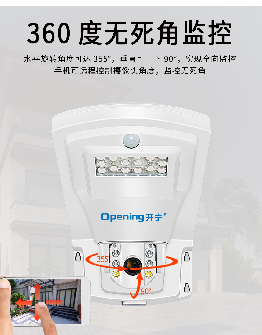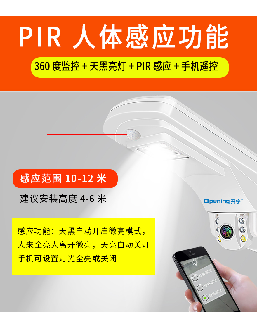 2、監(jiān)控照明一體設(shè)計,360度監(jiān)控+天黑亮燈+PIR感應(yīng)+手機(jī)遙控;