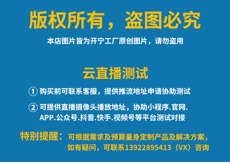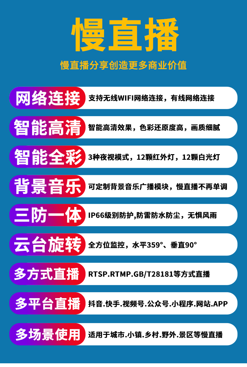 - 1、300萬有線/WIFI慢直播智能小球,一個(gè)小球就是一套慢直播系統(tǒng); 2、不僅可以監(jiān)控監(jiān)管,還可以實(shí)時(shí)慢直播分享創(chuàng)造更多商業(yè)價(jià)值; 3、明廚亮灶.在線驗(yàn)廠.城市慢直播.美麗鄉(xiāng)村.農(nóng)業(yè)慢直播.幼兒園慢直播.戶外慢直播等慢直播; 4、無需下載安裝APP,簡(jiǎn)單實(shí)用;不限觀看人數(shù),創(chuàng)造更多商業(yè)價(jià)值; 5、RTMP推流直播高清攝像頭;可生成慢直播二維碼,只需掃碼即可觀看慢直播; 6、可接入網(wǎng)站.公眾號(hào).小程序.APP;可對(duì)接抖音.快手.視頻號(hào).淘寶.拼多多等平臺(tái); 7、支持GB28181協(xié)議;可接公安.食品.工地.生產(chǎn).教育.畜牧.旅游等監(jiān)管部門平臺(tái); 8、高清慢直播、本地錄像錄音、報(bào)警多功能于一體;支持64/128G/256G內(nèi)存卡; 9、12顆高效能點(diǎn)陣紅外燈,12顆高效能點(diǎn)陣白光燈,鏡頭4MM/6MM可選,夜視5-50米; 10、APP可選擇紅外模式、全彩模式和智能模式三種模式其中一種模式; 11、智能模式,沒有物體移動(dòng)紅外燈亮,有物體移動(dòng)白光燈亮; 12、內(nèi)置高清保真拾音器,有聲有色實(shí)時(shí)直播;高清晰喇叭,APP語音對(duì)講,智能語音警戒報(bào)警;DC12V供電; 13、免費(fèi)提供集中管理平臺(tái),可實(shí)現(xiàn)集中管理慢直播攝像頭,有效提高工作效率; 14、人形檢測(cè)報(bào)警、移動(dòng)偵測(cè)報(bào)警、自動(dòng)跟蹤,手機(jī)推送。