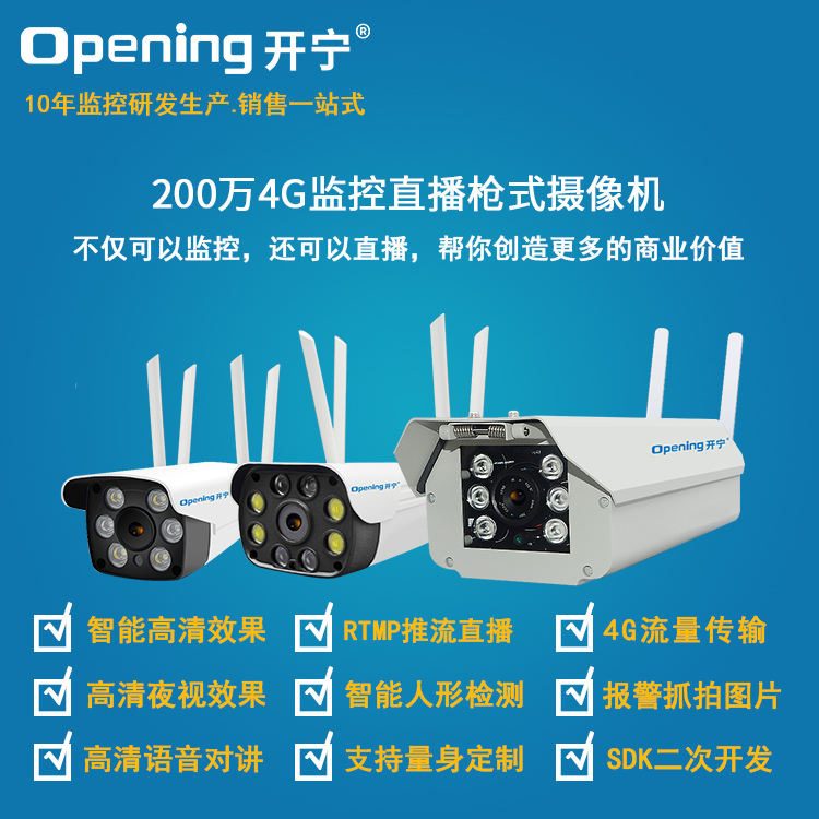 - 1、200萬/500萬4G智能監(jiān)控直播網(wǎng)絡高清防水攝像機,一個攝像機就是一套監(jiān)控直播系統(tǒng);