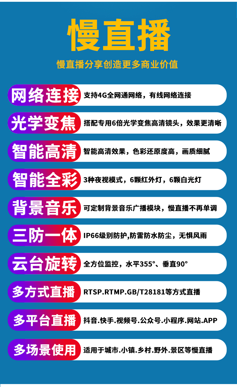 - 1、300萬4寸4G6倍變焦慢直播智能球機,一個小球就是一套慢直播系統(tǒng);支持水平和垂直旋轉(zhuǎn);