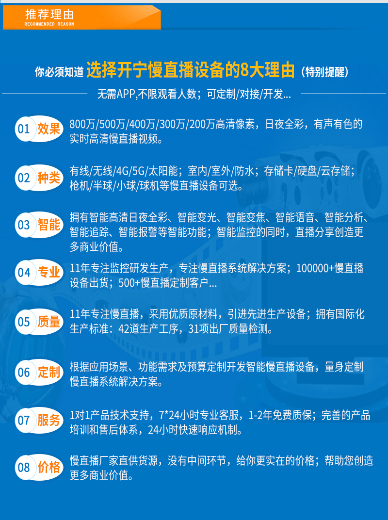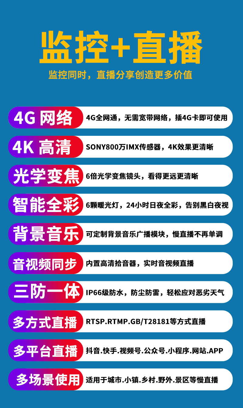 - 1、300萬/500萬/800萬4K慢直播智能全彩高清攝像機(jī),一個(gè)攝像機(jī)就是一套慢直播系統(tǒng);
