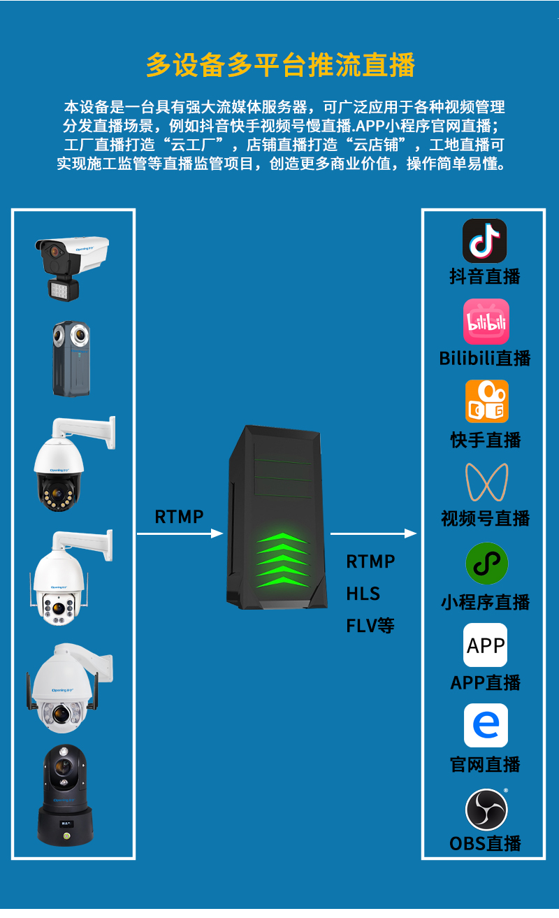 3.支持標(biāo)準(zhǔn)RTMP協(xié)議,兼容RTMP主流直播平臺
