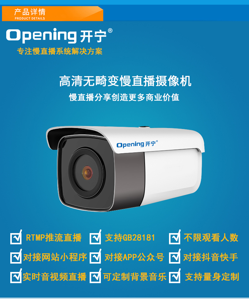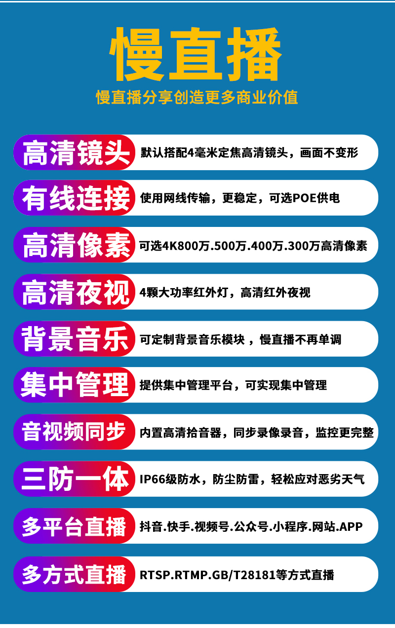 - 1、4K800萬/500萬/400萬/300萬紅外高清無畸變慢直播攝像機(jī),一個(gè)攝像機(jī)就是一套監(jiān)控直播系統(tǒng);