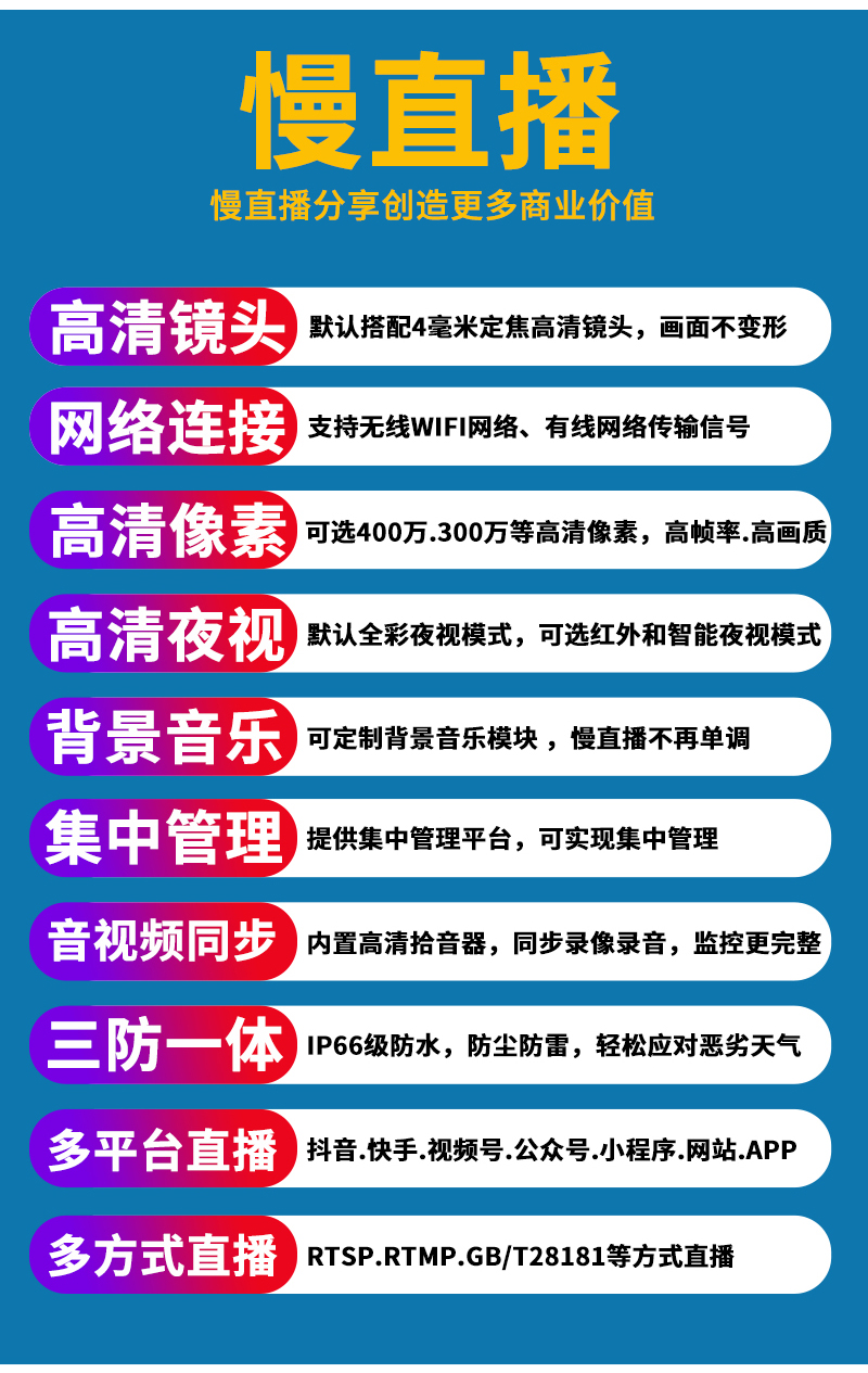 - 1、300萬/400萬WIFI無畸變雙光慢直播高清攝像機,一個攝像機就是一套慢直播系統(tǒng);