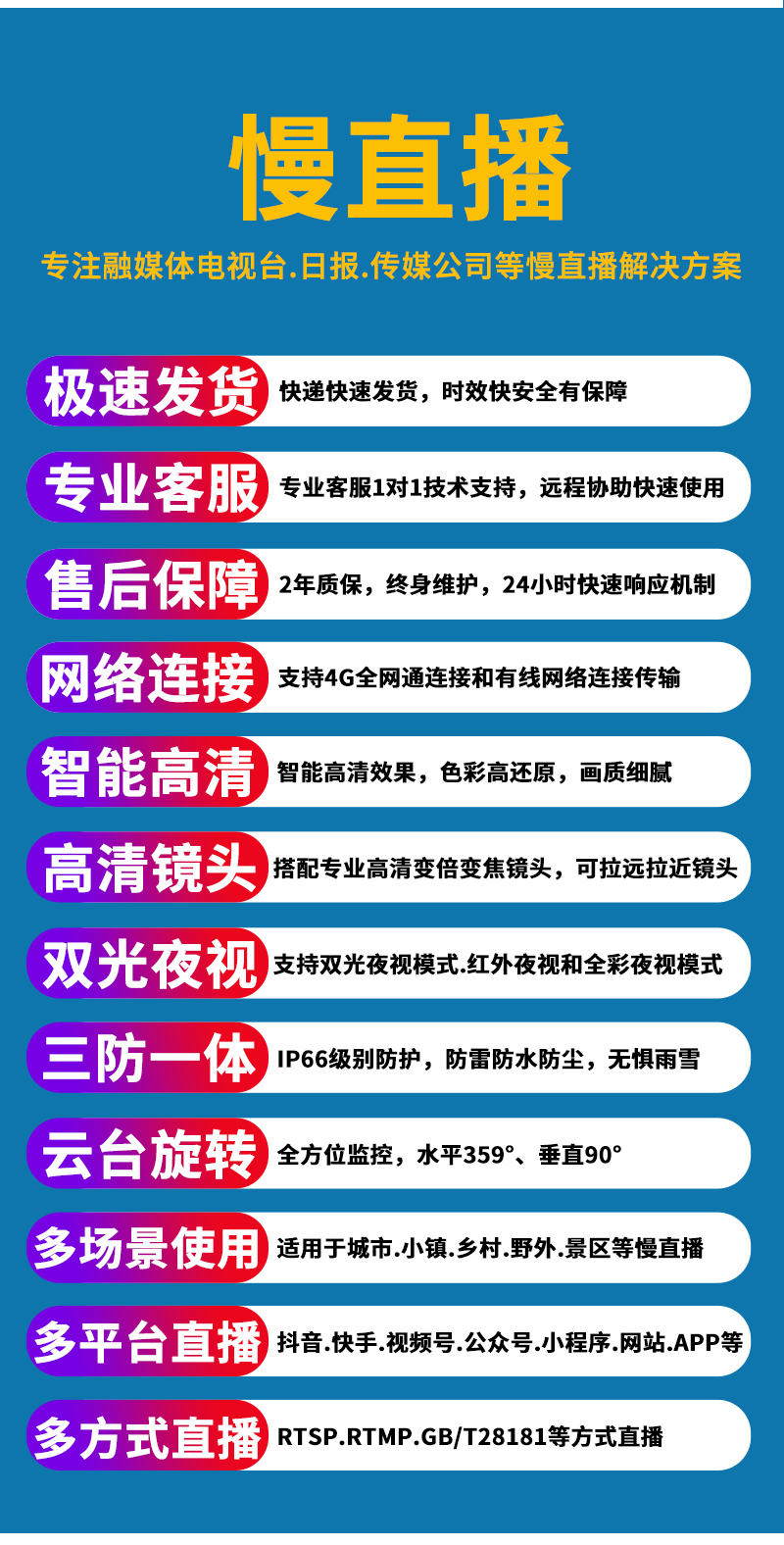 2、內(nèi)置智能4G模塊,沒有寬帶網(wǎng)絡(luò)的地方也能實(shí)現(xiàn)實(shí)時(shí)慢直播;另外選配太陽能供電系統(tǒng)可實(shí)現(xiàn)無電無網(wǎng)實(shí)時(shí)慢直播;