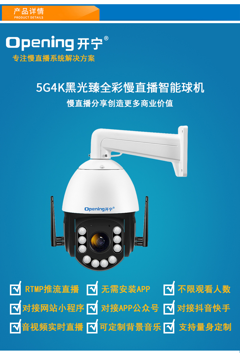 - 1、4K800萬6寸5G 20倍黑光臻全彩慢直播智能高清球機(jī),一個(gè)球機(jī)就是一套慢直播系統(tǒng);支持360度旋轉(zhuǎn),支持預(yù)置點(diǎn)和巡航,20倍光學(xué)變焦,半金屬外觀,IP66防水等級(jí);